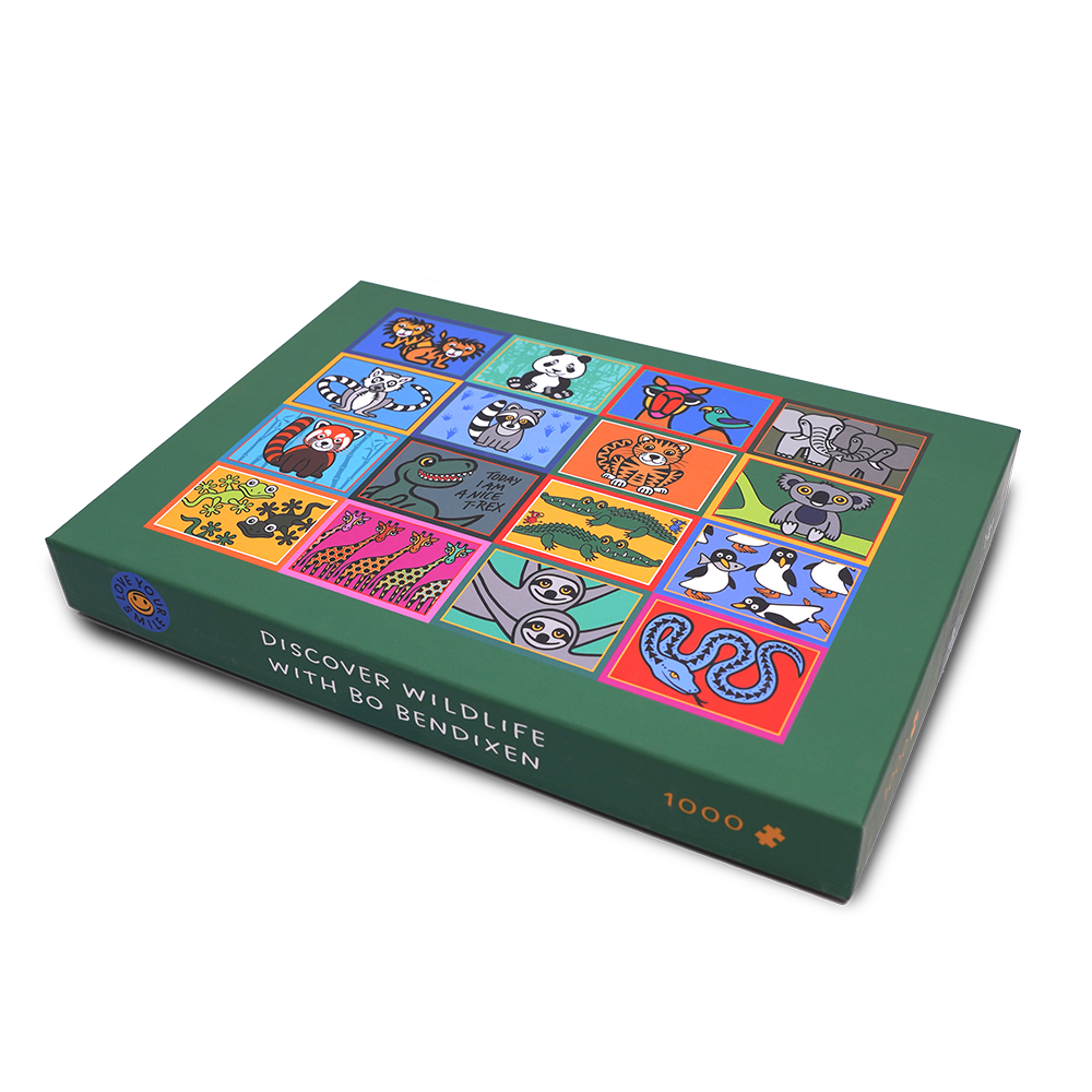 Tag på en visuel safari gennem naturens mangfoldighed med “Wildlife”, et farverigt 1000-brikkers puslespil af Bo Bendixen. Her møder du vilde dyr som elefanter, løver og aber – alt gengivet i den ikoniske, livlige stil, som kendetegner Bendixens kunst.